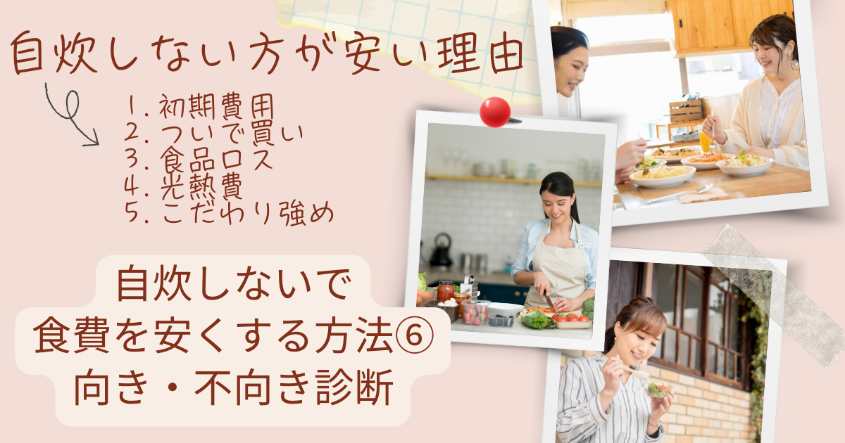 • 自炊しないで食費を安くするには、予算を決める、お得情報の活用、ご飯常備、冷凍食品・レトルト・割引惣菜・宅配弁当を活用する。