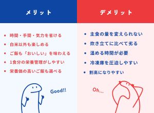 | 時間・手間・気力を省ける 白米以外のご飯や麺類も楽しめる ご飯も「おいしい」を最後まで味わえる 主食を含む1食分の栄養管理がしやすい 栄養価の高いご飯も選べる | 主食の量を変えられない 炊き立てに比べて劣る おかずのみより温める時間が必要 おかずのみより冷凍庫を圧迫しやすい 割高になりやすい |