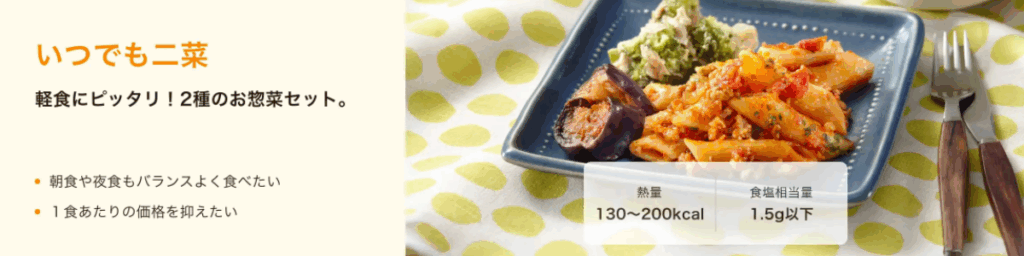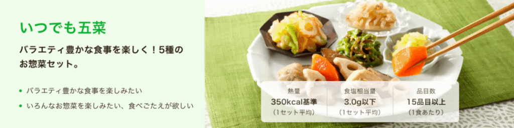 ワタミの宅食ダイレクトは、メイン1品と副菜2品の「いつでも三菜」、メイン1品と副菜4品の「いつでも五菜」が定番のシリーズです。